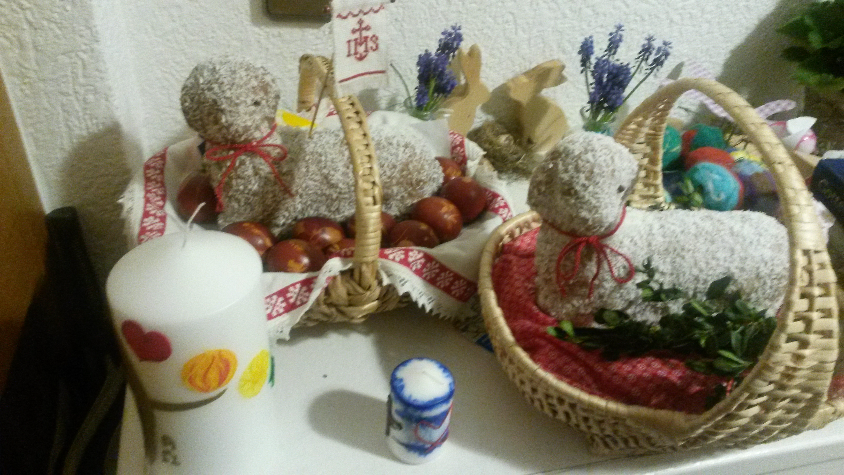 Jedes Jahr gestalten wir eine Osterkerze, die in der Osternacht in der Kirche geweiht wird. Sie steht das ganze Jahr am Esstisch und wird immer wieder angezündet.