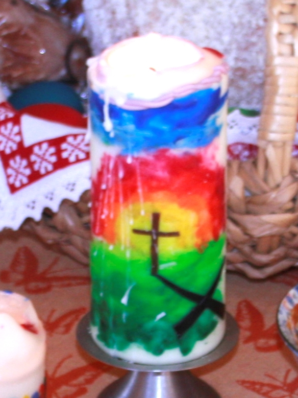 2015 haben wir die farbigen Wachsplatten über einer Flamme erhitzt und dann auf die Kerze „geschmiert“. Zunächst wurde dabei der Hintergrund gestaltet, anschließend das Kreuz aus einer braunen Wachsplatte gemacht, den „Schatten“ schnitten wir aus dunklerem Wachs aus. Jahreszahl, sowie Alpha und Omega sind auf der Rückseite angebracht. Am oberen Rand erkennt man zwei gedrehte Wachsstränge, die als Tropfschutz dienen sollten (man sieht, dass das nicht so geglückt ist).