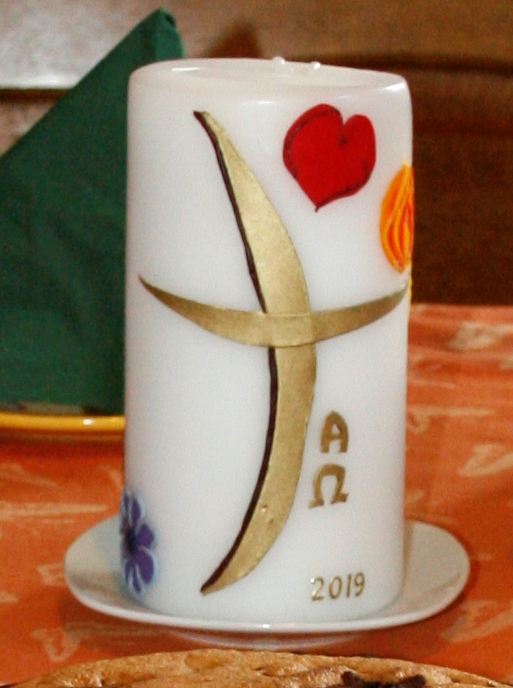 Im Jahr 2019 hatte unsere Osterkerze ein goldenes, geschwungenes Kreuz, eine goldene Jahreszahl aus Wachsaufkleber und auf der Rückseite wurden 7 Wachskreise (ausgestochen) in den Farben des Regenbogens angebracht. Die Kreise wurden mit verschiedenen Symbolen aus Wachs geschmückt. Leider ist nicht alles auf den Bildern zu sehen. Deshalb hier die Symbole: