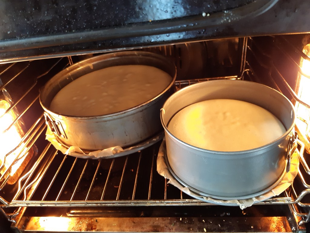 Bereite aus den Zutaten einen Biskuitteig zu und fülle ihn in zwei unterschiedlich große Springformen. Dann lässt du ihn für 30 Minuten bei 180°C backen.