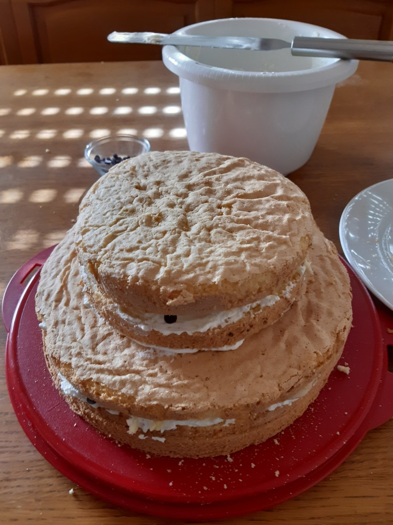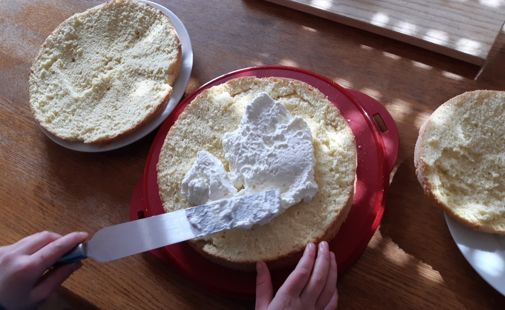 Berstreiche beide Tortenbodenhälften mit Sahne.