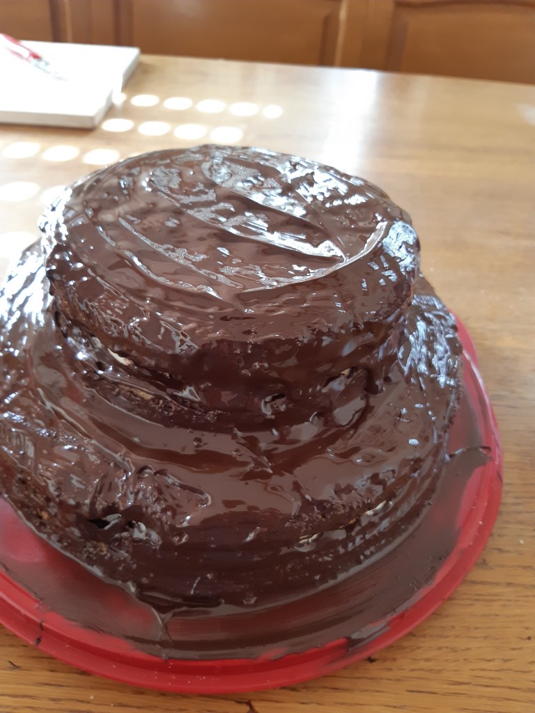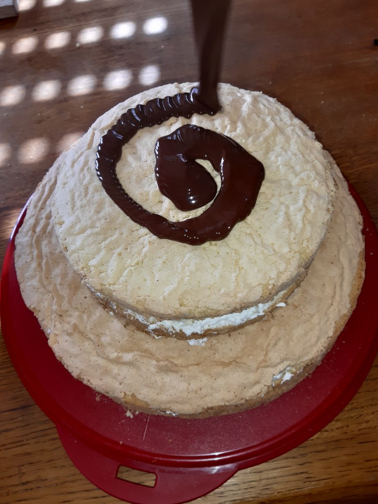Gieße die flüssige Schokoladenglasur über den Kuchen.